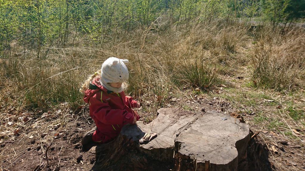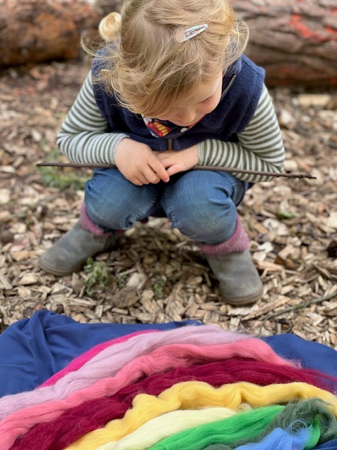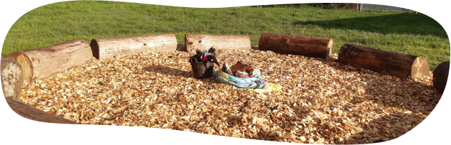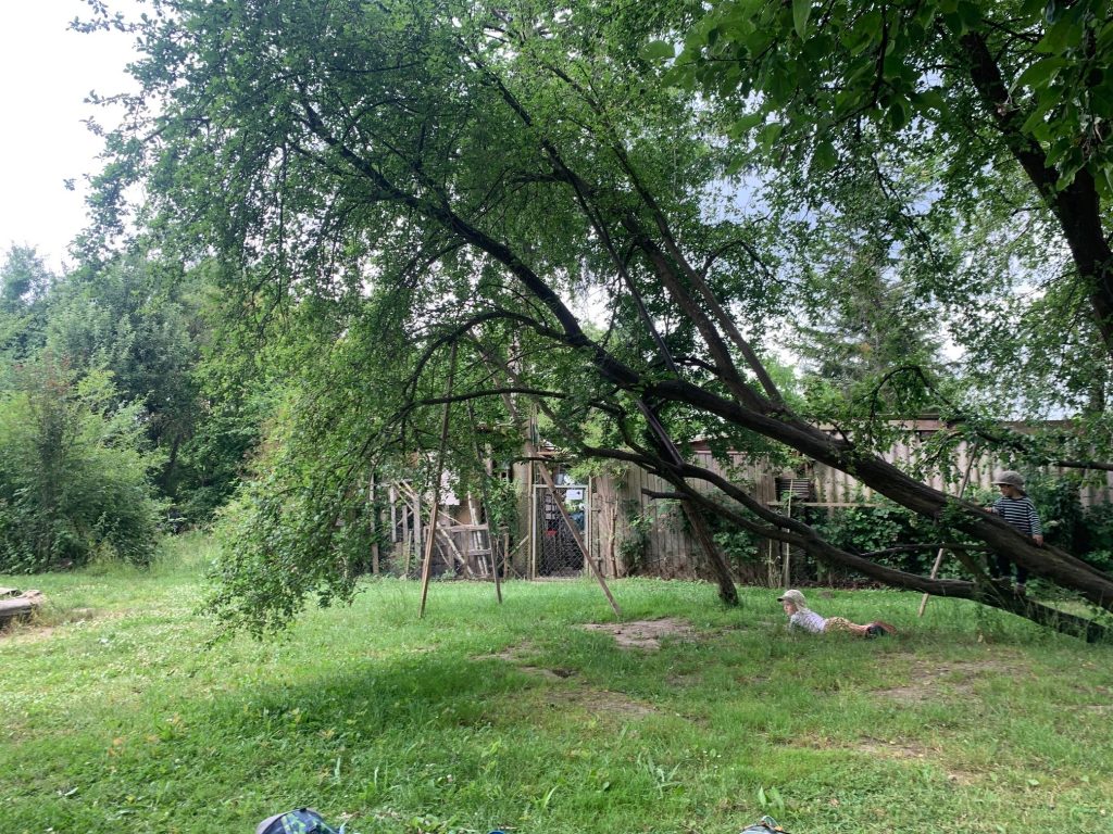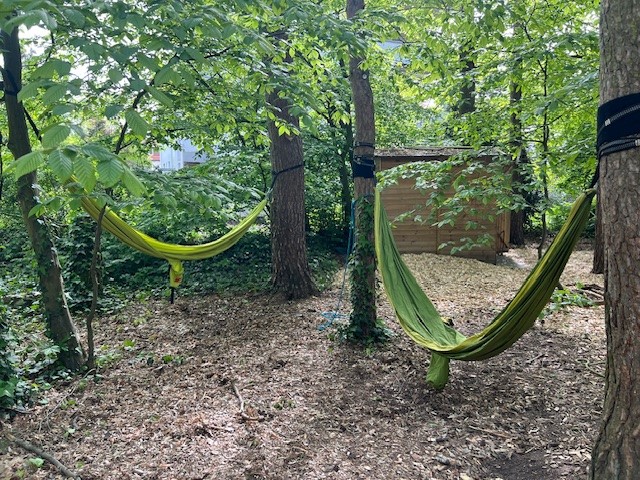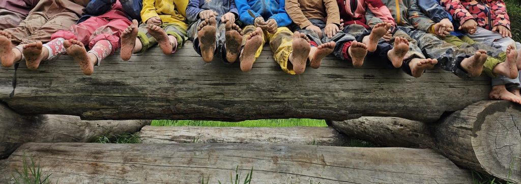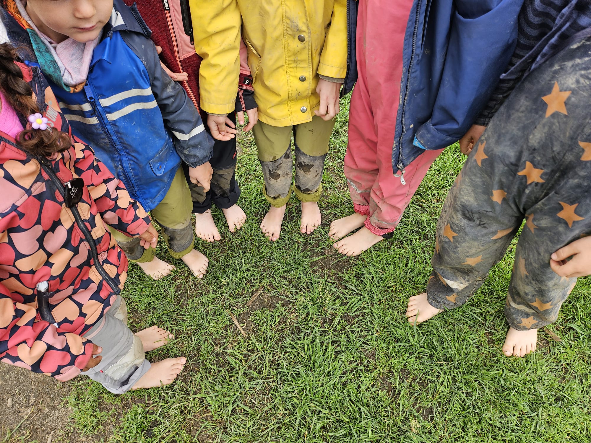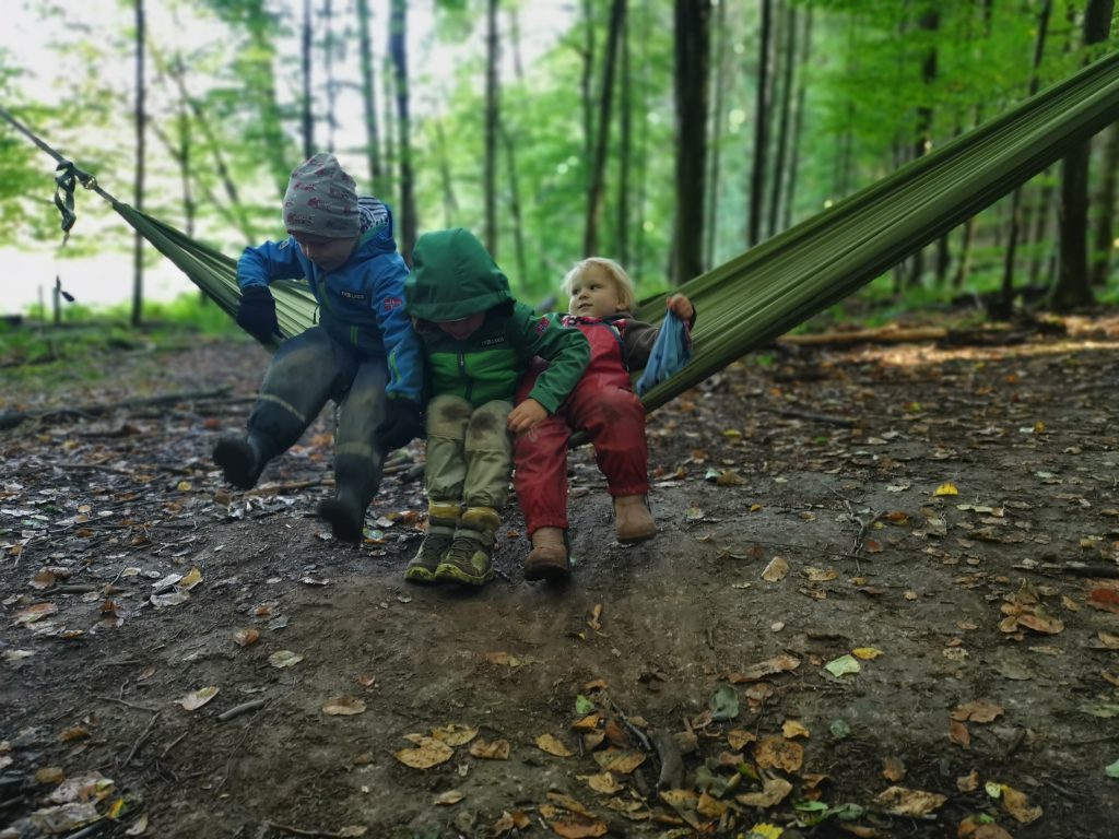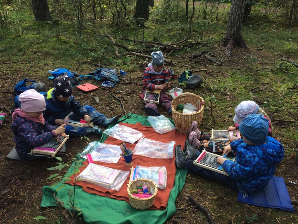 im lehmigen Matsch hüpfen, im Birken- und Farnwäldchen Nester und Verstecke bauen, im angrenzenden Bach spielen, auf Baumstämmen balancieren, Vögel beobachten, in der Hängematte den Blättern beim „Himmelkitzeln“ zuschauen und schaukeln, schnitzen, malen, werkeln, weben und mit Wolle basteln.